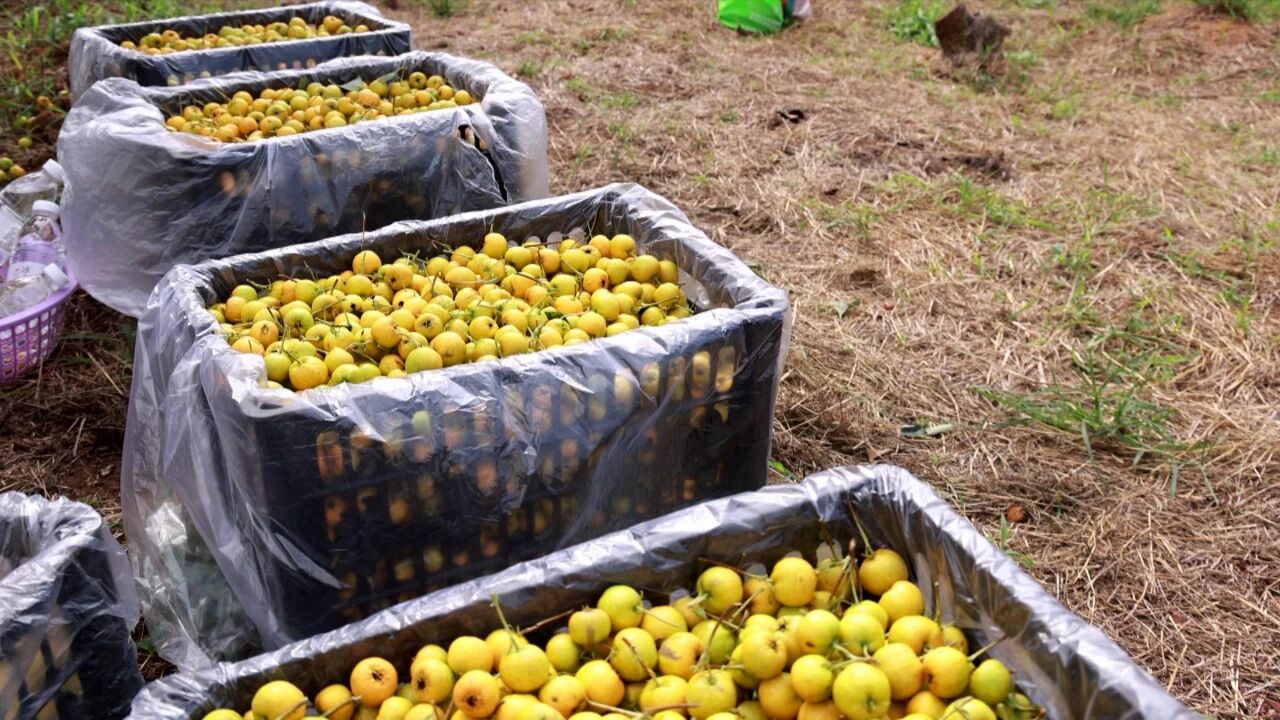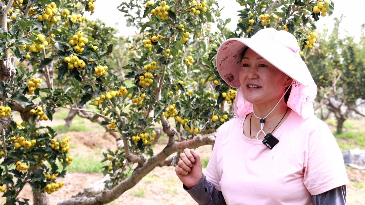 东蒙镇山楂种植户 彭红梅:“这种黄山楂是2023年嫁接的,大约在四五百棵上,今年第二年结果,一棵树能结八十到一百斤。这个山楂是一种鲜食水果,可以生吃,也可以加工成罐头,目前主要是电商和超市在销售,价格在十五至二十元一斤,效益非常可观。”