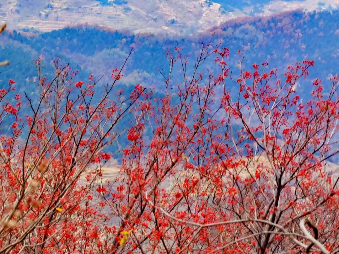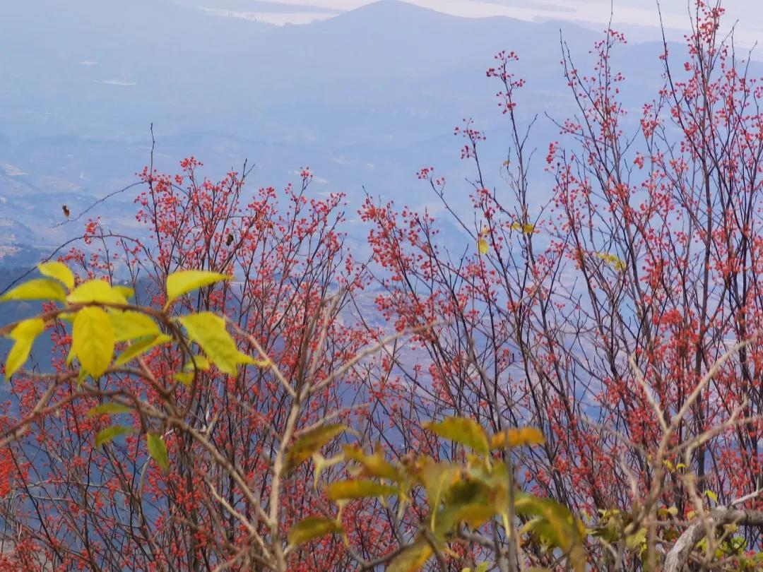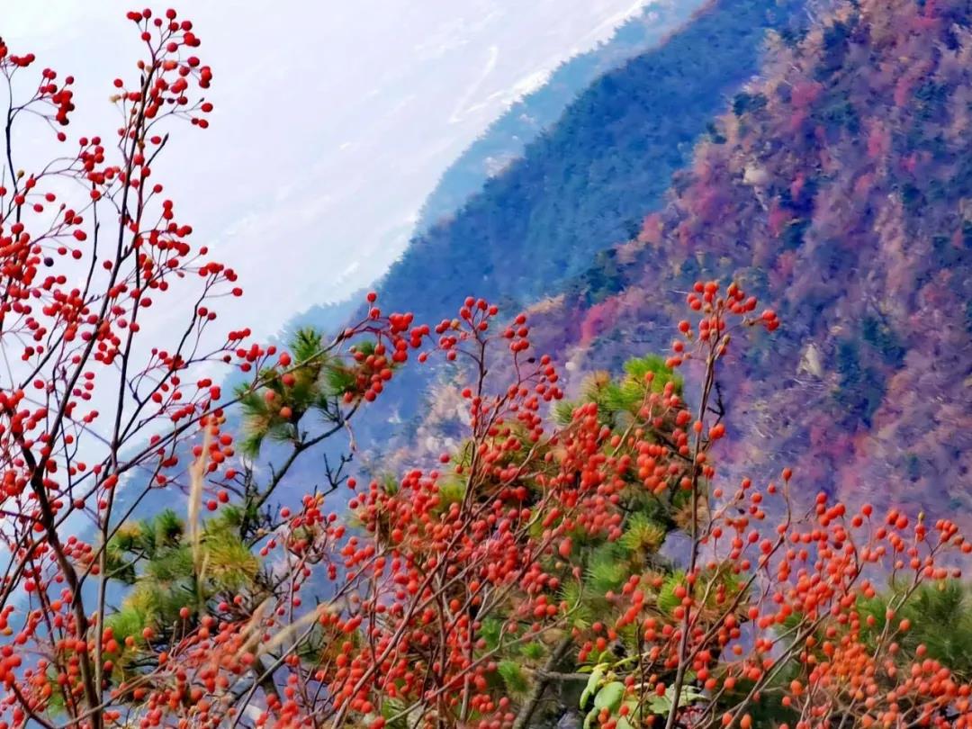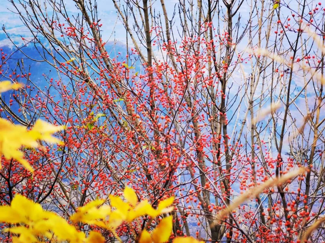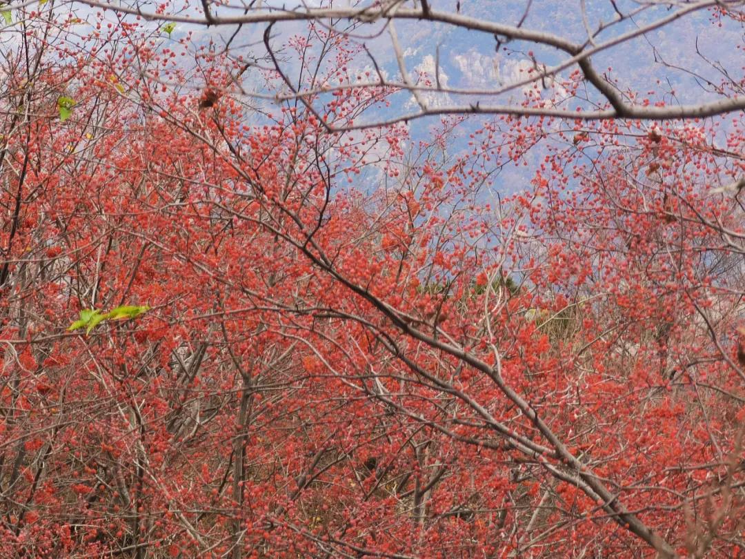秋冬时节的天蒙山,山石如黛,蓝天如洗,苍松似墨,丹枫胜火,层林尽染,色彩斑斓,美不胜收!山巅的近万颗棵花楸树枝头已挂满簇簇红豆,明艳动人,严寒季节也不舍坠落,装饰着北国的秋冬,默默收藏着世人的无限相思。