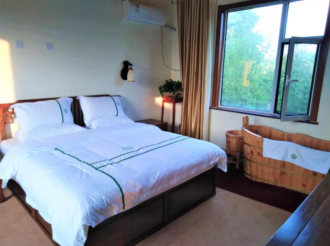 隐藏在山水田园中的原木风格民宿,彰显雅致格调与品位,充满浓郁的药香与木香,室内可洗药浴、足浴,所用药汤是用高锶矿泉水和园中栽种药材熬制而成,可起到疏通经络、活血化淤、驱风散寒、清热解毒、消肿止痛、协调脏腑、通行气血、濡养全身等养生功效。