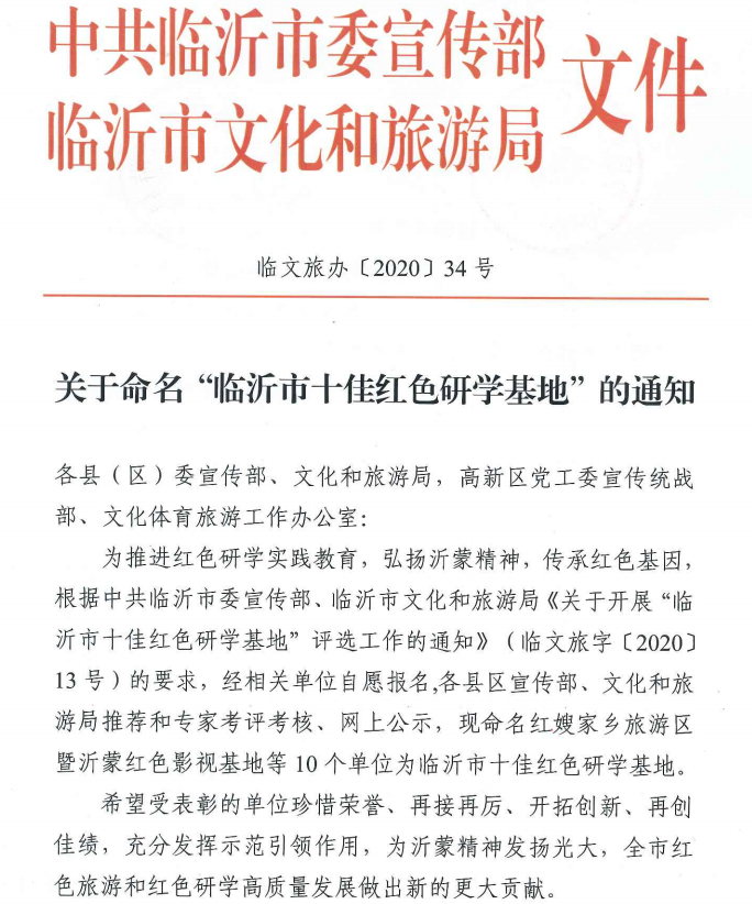11月2日,临沂市文化和旅游局联合市委宣传部印发《关于命名“临沂市十佳红色研学基地”的通知》,命名红嫂家乡旅游区暨沂蒙红色影视基地等10个单位为临沂市十佳红色研学基地。
