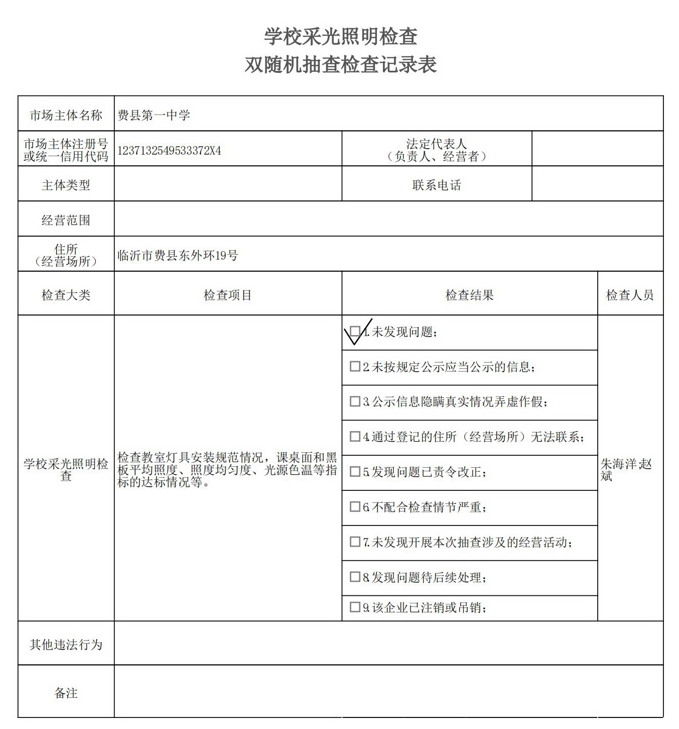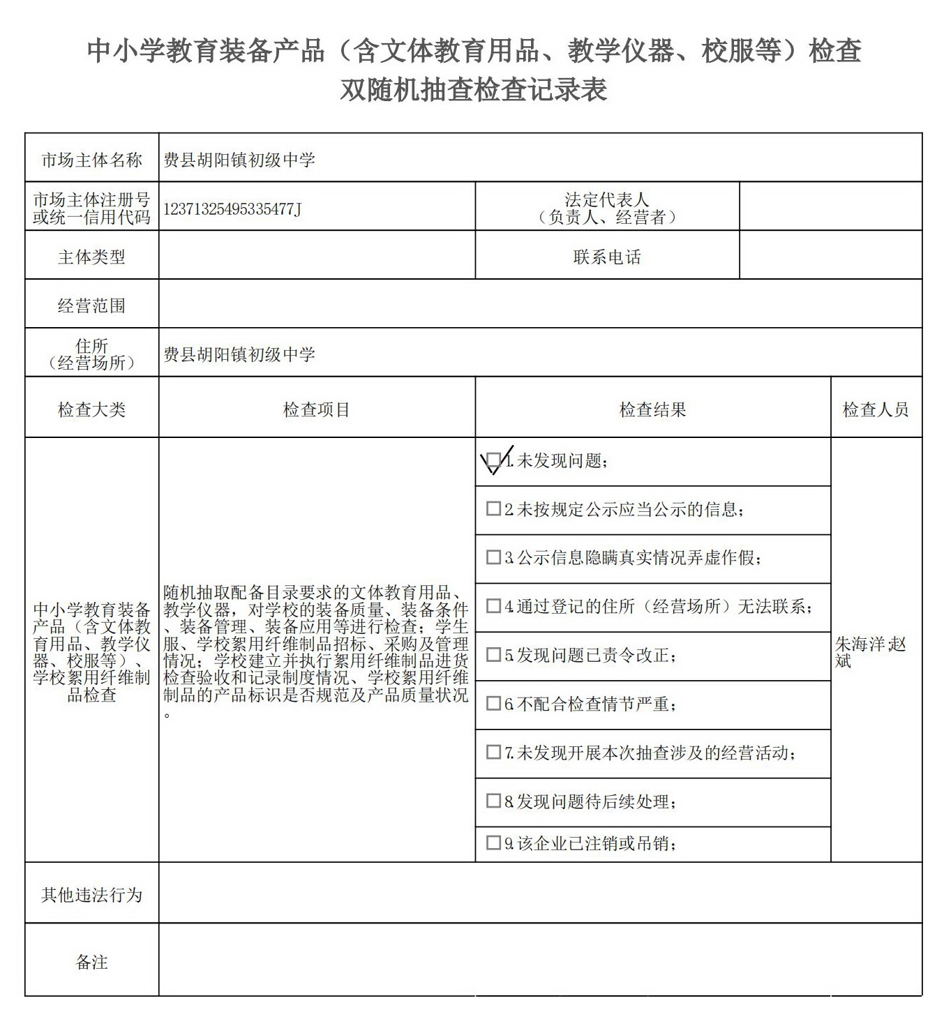 费县教体局“双随机、一公开”检查结果(中小学教育装备产品含文体教育用品、教学仪器、校服等监督检查)