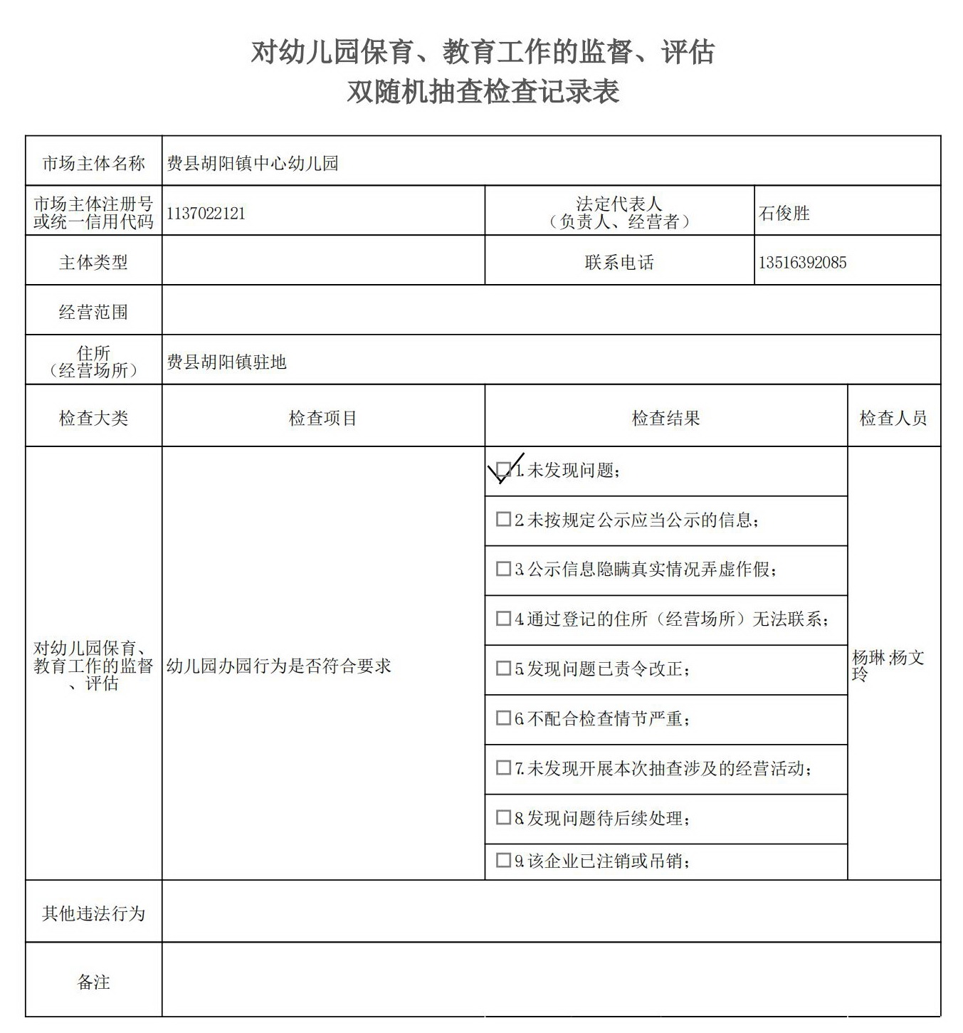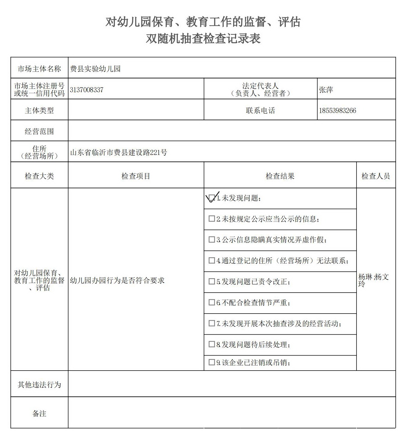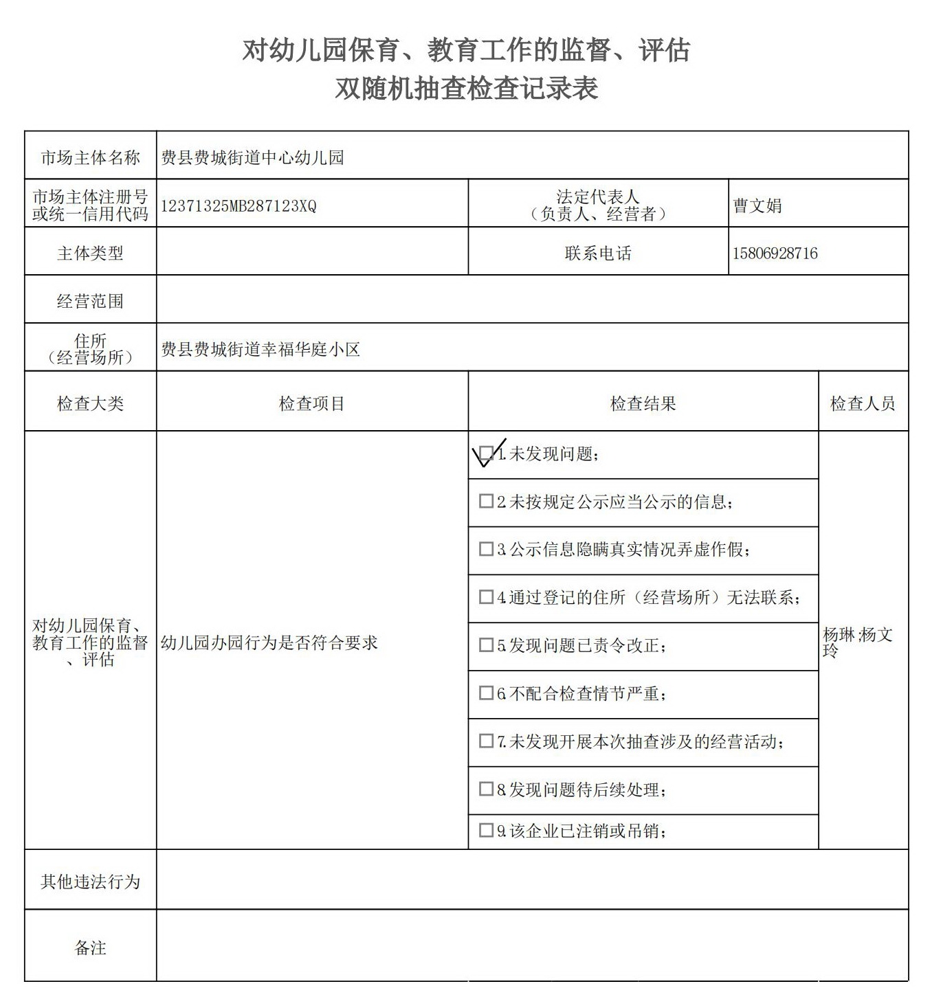 费县教体局“双随机、一公开”检查结果(对幼儿园保育、教育工作的监督、评估)
