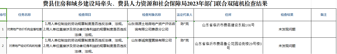 费县住房和城乡建设局牵头、费县人力资源和社会保障局2023年部门联合双随机检查结果