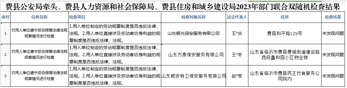 费县公安局牵头、费县人力资源和社会保障局、费县住房和城乡建设局2023年部门联合双随机检查结果