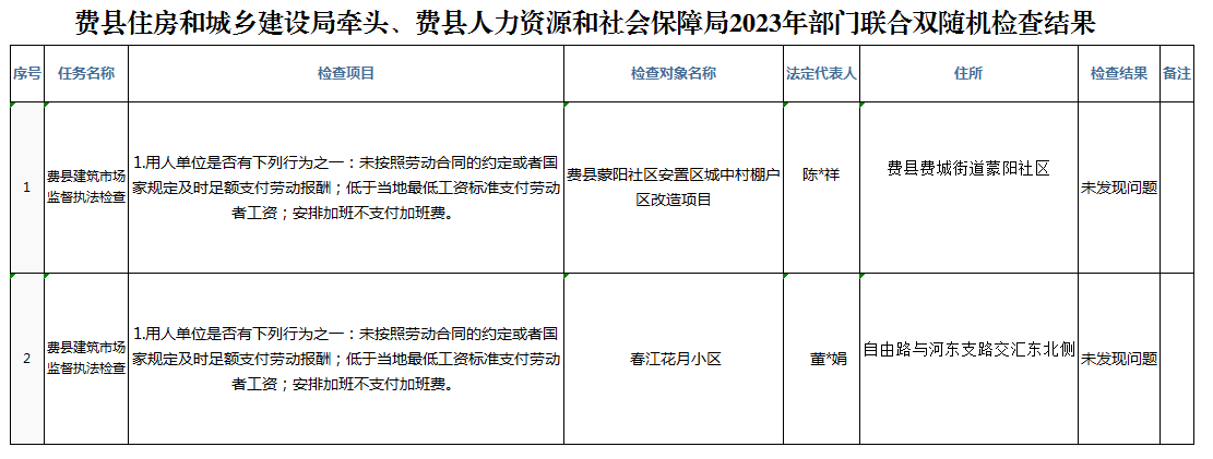 费县住房和城乡建设局牵头、费县人力资源和社会保障局2023年部门联合双随机检查结果