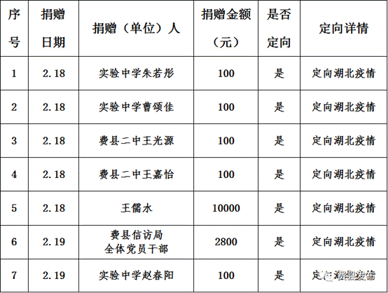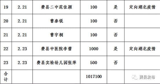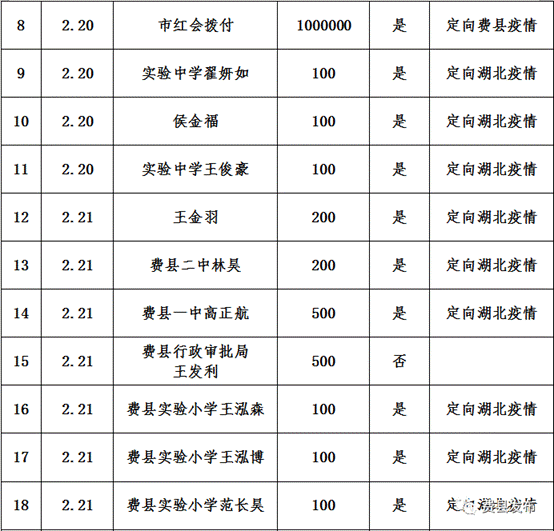 2020年2月18日0时至2月23日24时,费县红十字会接受社会各界新型肺炎疫情防控捐款1017100元,其中17100元(定向15900元,非定向1200元)用于湖北疫情(已转市红会统一划拨)。其余1000000元为市红十字会转拨,定向用于费县疫情防控,已经县新型冠状病毒肺炎疫情处置工作领导小组(指挥部)批准,定向拨付县教体局等单位,用于我县疫情防控工作。具体明细如下: