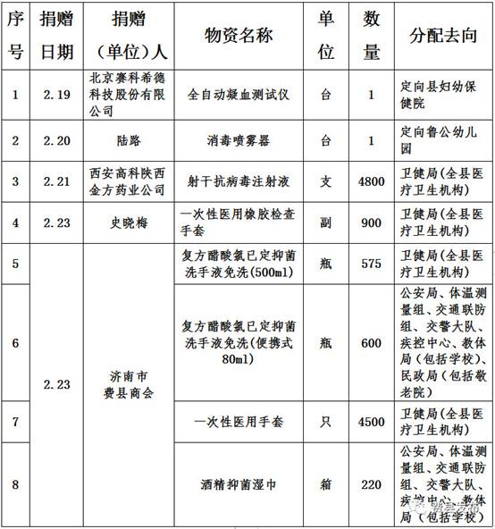 2020年2月18日0时至2月23日24时,费县红十字会直接接受社会各界新型肺炎疫情防控捐赠物资8笔。全部物资已按照捐赠方意愿,经县新型冠状病毒肺炎疫情处置工作领导小组(指挥部)批准,分配有关单位使用。具体明细如下:
