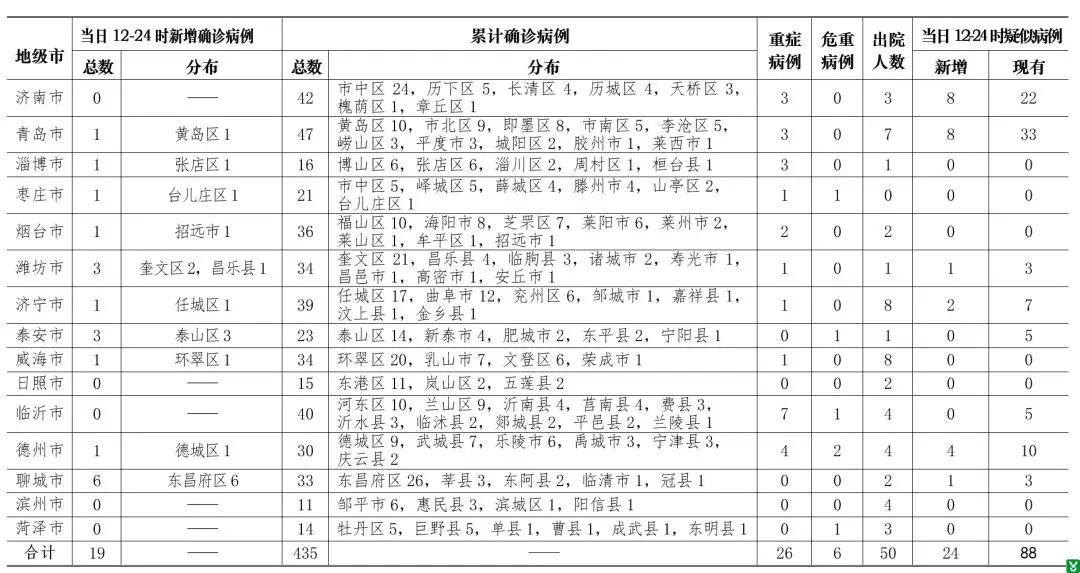 2020年2月8日12-24时,山东省报告新型冠状病毒肺炎新增确诊病例19例,累计确诊病例435例(含重症病例26例,危重症病例6例,治愈出院50例,死亡病例1例);新增疑似病例24例,现有疑似病例88例。截至目前,追踪到密切接触者12422人,已解除医学观察7910人,诊断为疑似或确诊218例,尚有4294人正在接受医学观察。