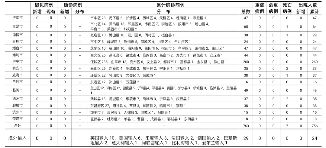 山东无本地住院疑似病例、确诊病例。累计报告确诊病例763例,死亡7例,治愈出院756例。