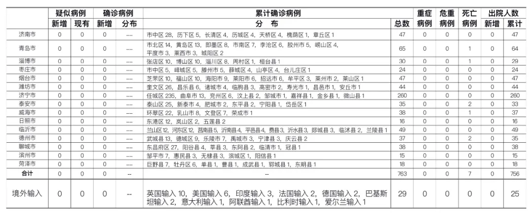 山东无本地住院疑似病例、确诊病例。累计报告确诊病例763例,死亡7例,治愈出院756例。