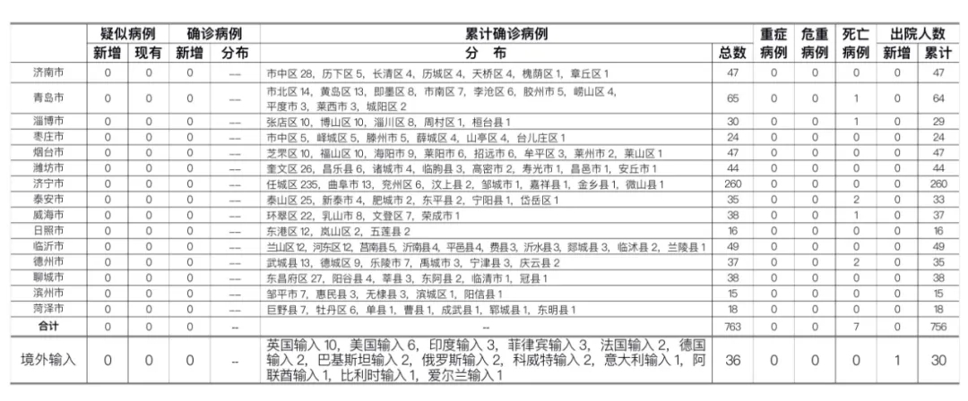 山东无本地住院疑似病例、确诊病例。累计报告确诊病例763例,死亡7例,治愈出院756例。