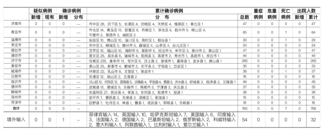 山东无本地住院疑似病例、确诊病例。累计报告确诊病例763例,死亡7例,治愈出院756例。