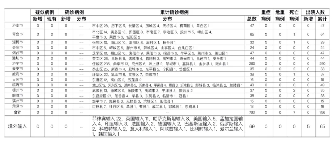山东无本地住院疑似病例、确诊病例。累计报告确诊病例763例,死亡7例,治愈出院756例。