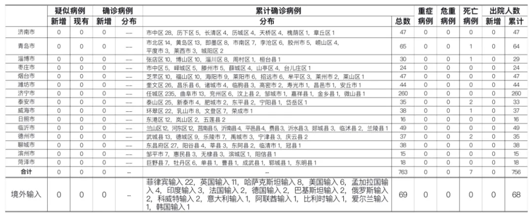 山东无本地住院疑似病例、确诊病例。累计报告确诊病例763例,死亡7例,治愈出院756例。