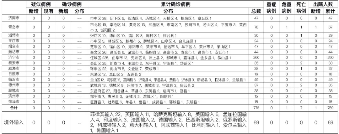 山东无新增本地疑似病例、确诊病例。累计报告确诊病例776例,死亡7例。新增治愈出院病例1例,累计治愈出院759例。