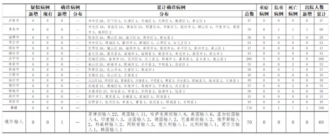 山东无新增本地疑似病例、确诊病例。累计报告确诊病例776例,死亡7例。新增治愈出院病例1例,累计治愈出院760例。