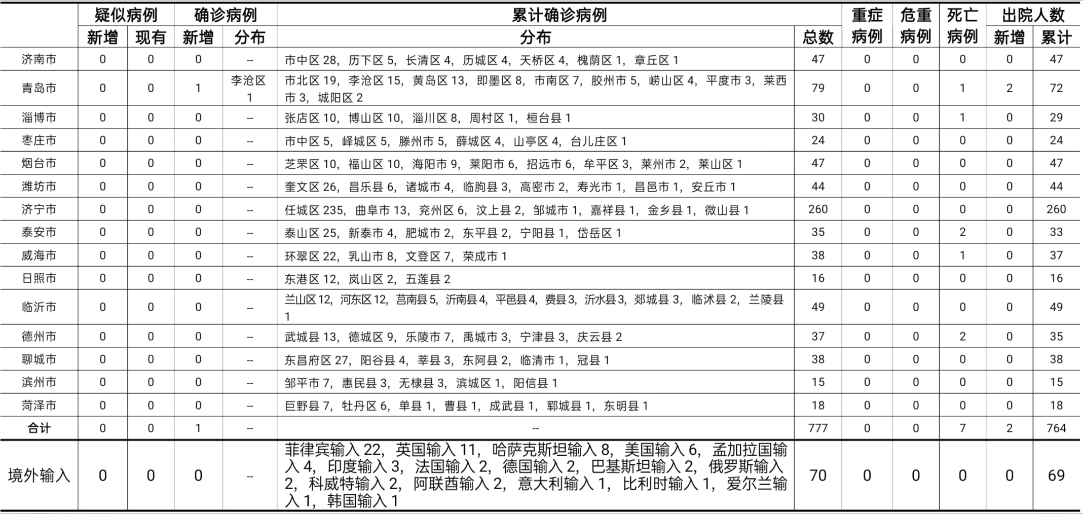 备注:1.山东省本地病例按确诊时医院所在县区统计,境外输入病例单独统计。