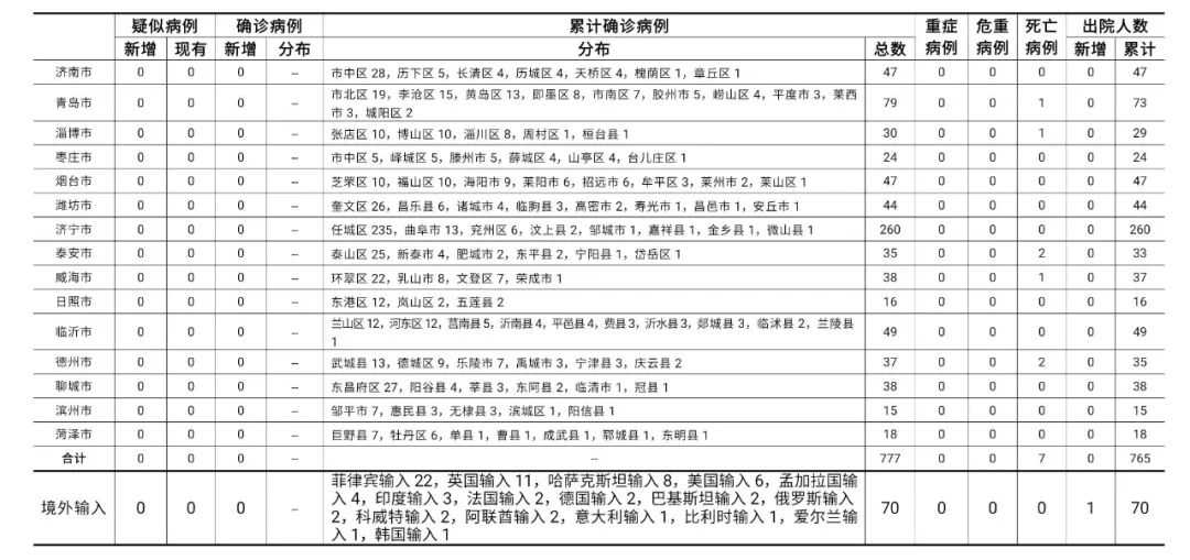 山东无新增本地疑似病例、确诊病例。累计报告确诊病例777例,死亡7例,治愈出院765例。