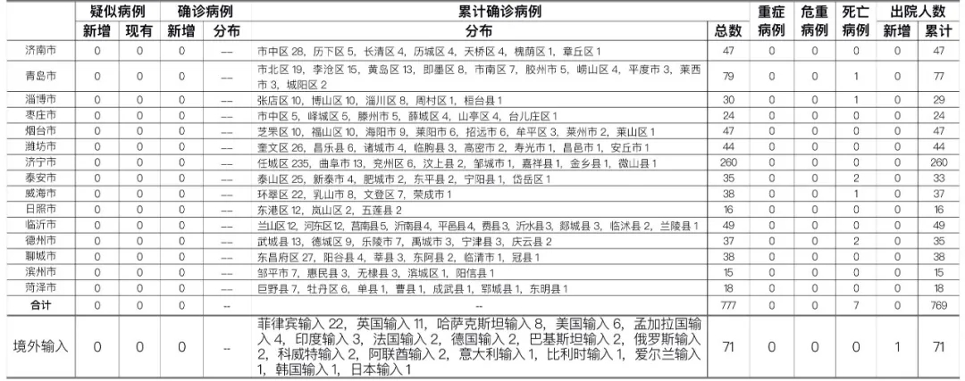 山东无新增本地疑似病例、确诊病例。累计报告确诊病例777例,死亡7例,治愈出院769例。