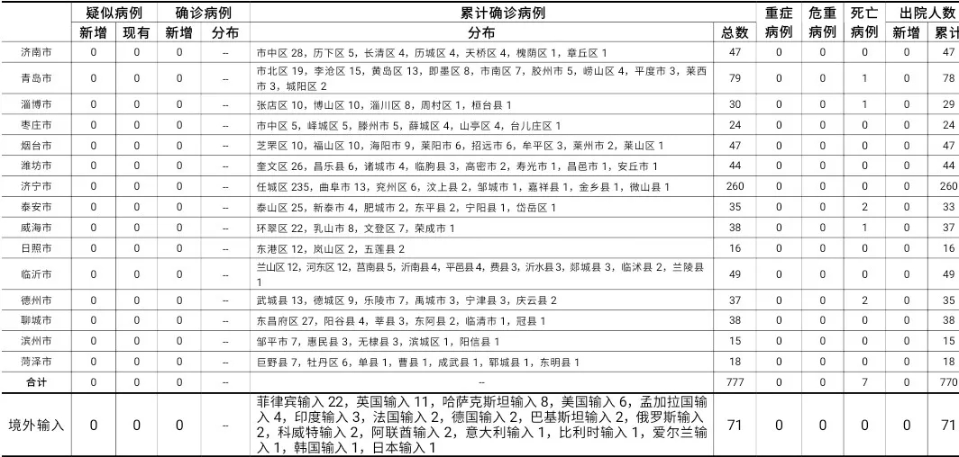 山东无新增本地疑似病例、确诊病例。累计报告确诊病例777例,死亡7例,治愈出院770例。