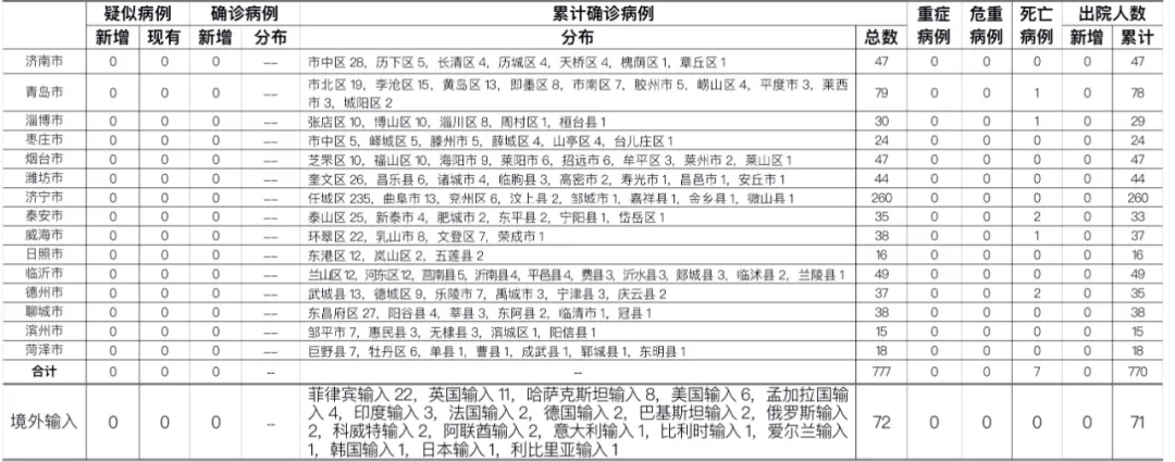 山东无新增本地疑似病例、确诊病例。累计报告确诊病例777例,死亡7例,治愈出院770例。
