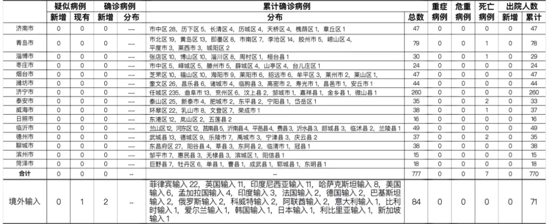 山东无新增本地疑似病例、确诊病例。累计报告确诊病例777例,死亡7例,治愈出院770例。