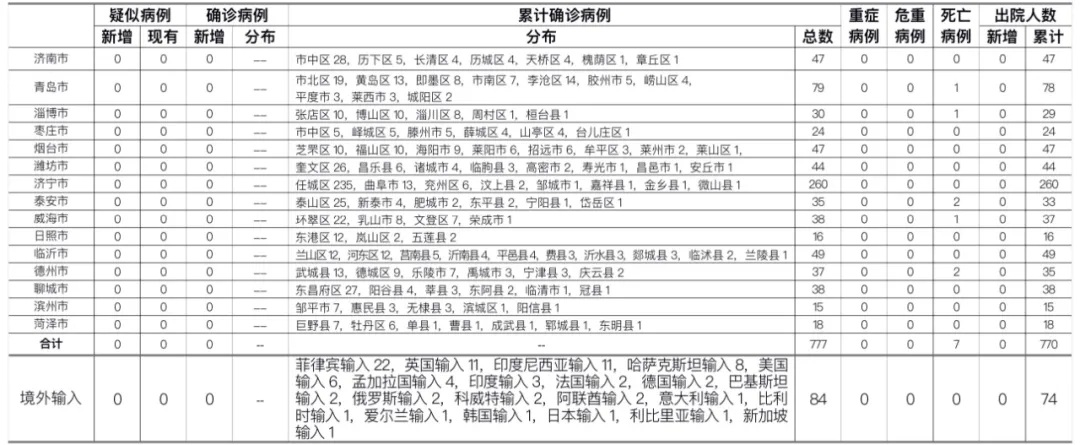 山东无新增本地疑似病例、确诊病例。累计报告确诊病例777例,死亡7例,治愈出院770例。