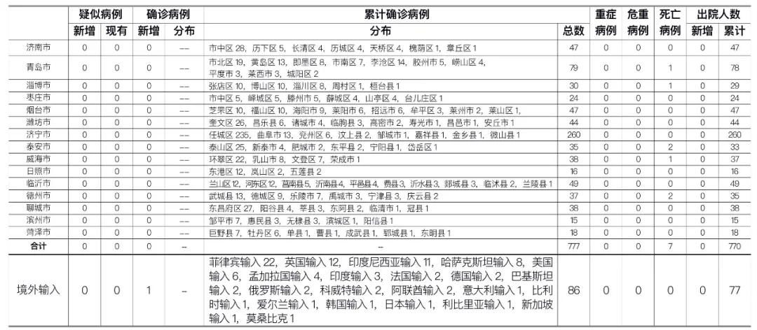备注:1.山东省本地病例按确诊时医院所在县区统计,境外输入病例单独统计。