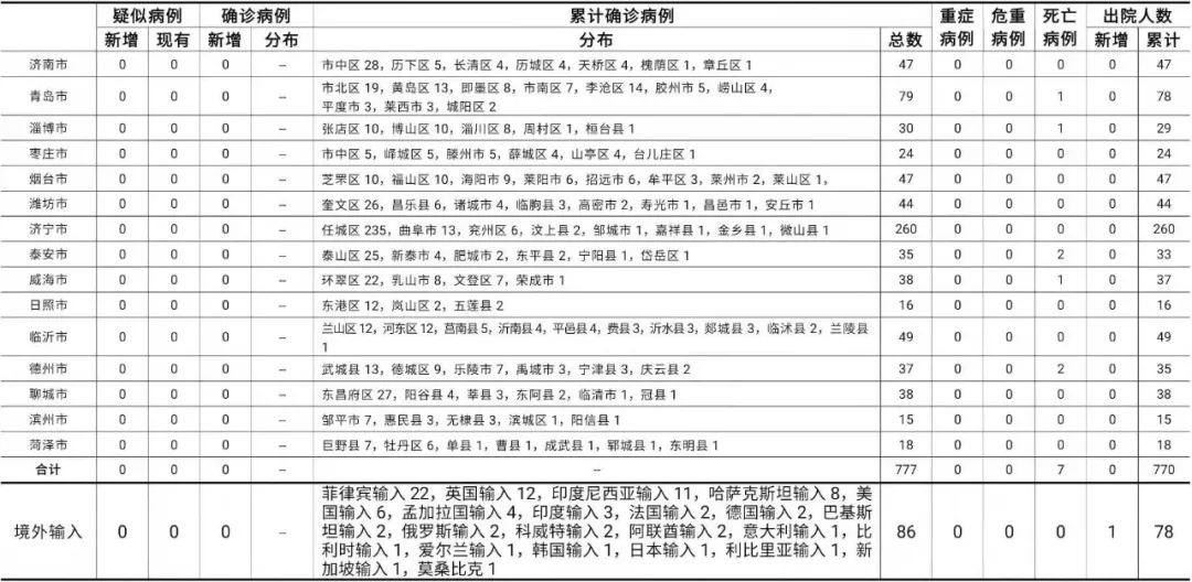 备注:1.山东省本地病例按确诊时医院所在县区统计,境外输入病例单独统计。