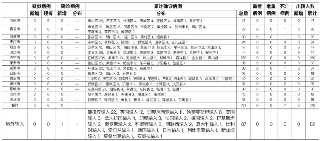 备注:1.山东省本地病例按确诊时医院所在县区统计,境外输入病例单独统计。