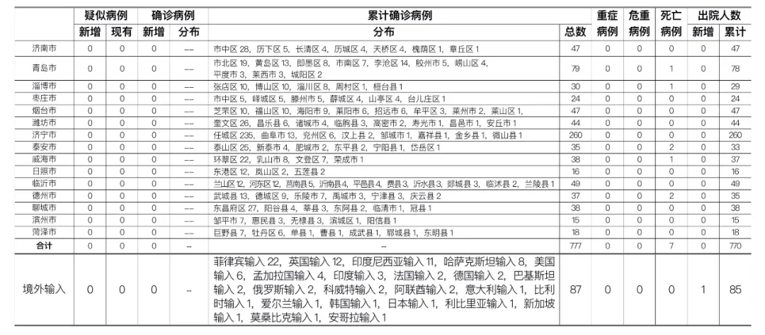备注:1.山东省本地病例按确诊时医院所在县区统计,境外输入病例单独统计。