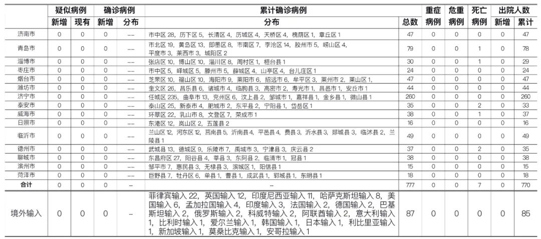 备注:1.山东省本地病例按确诊时医院所在县区统计,境外输入病例单独统计。