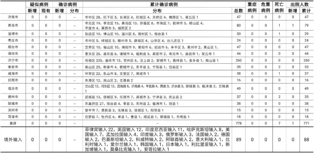 备注:1.山东省本地病例按确诊时医院所在县区统计,境外输入病例单独统计。