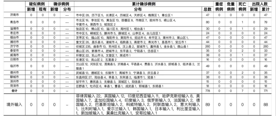 备注:1.山东省本地病例按确诊时医院所在县区统计,境外输入病例单独统计。