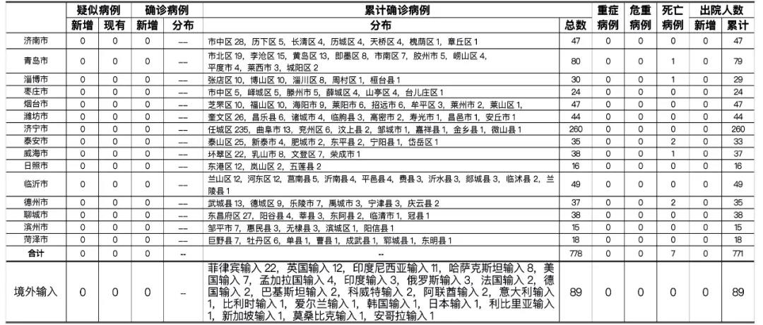 山东无新增本地疑似病例、确诊病例。累计报告确诊病例778例,死亡7例,治愈出院771例。