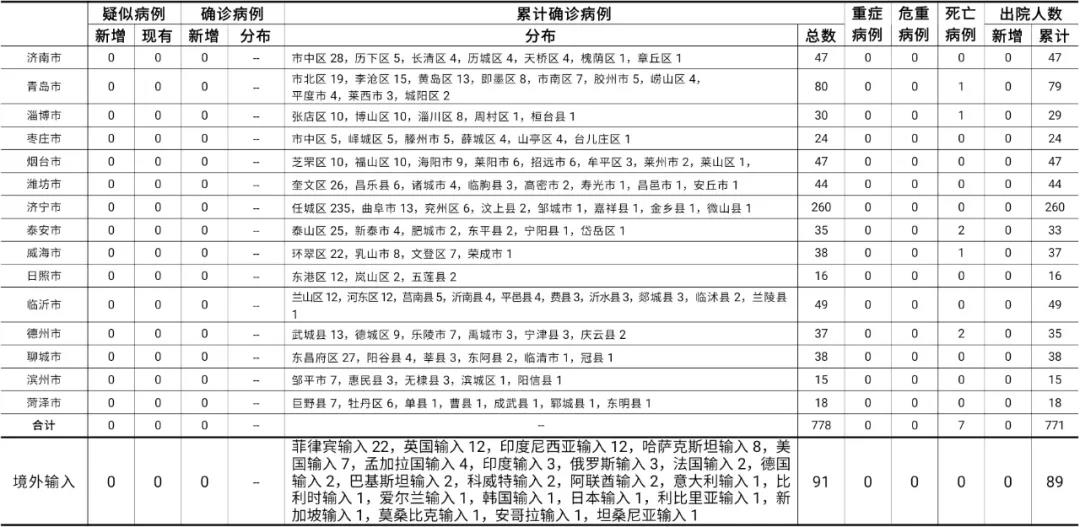备注:1.山东省本地病例按确诊时医院所在县区统计,境外输入病例单独统计。