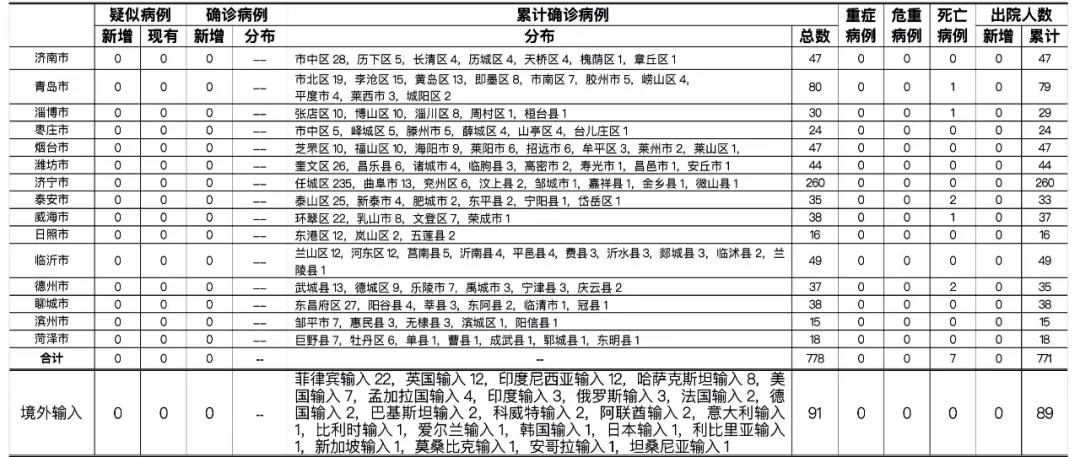 备注:1.山东省本地病例按确诊时医院所在县区统计,境外输入病例单独统计。