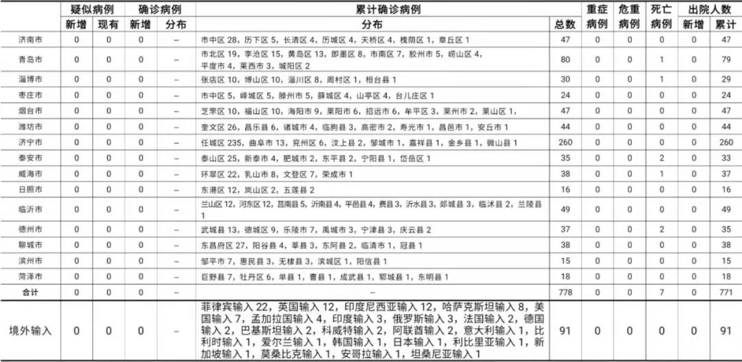 备注:1.山东省本地病例按确诊时医院所在县区统计,境外输入病例单独统计。