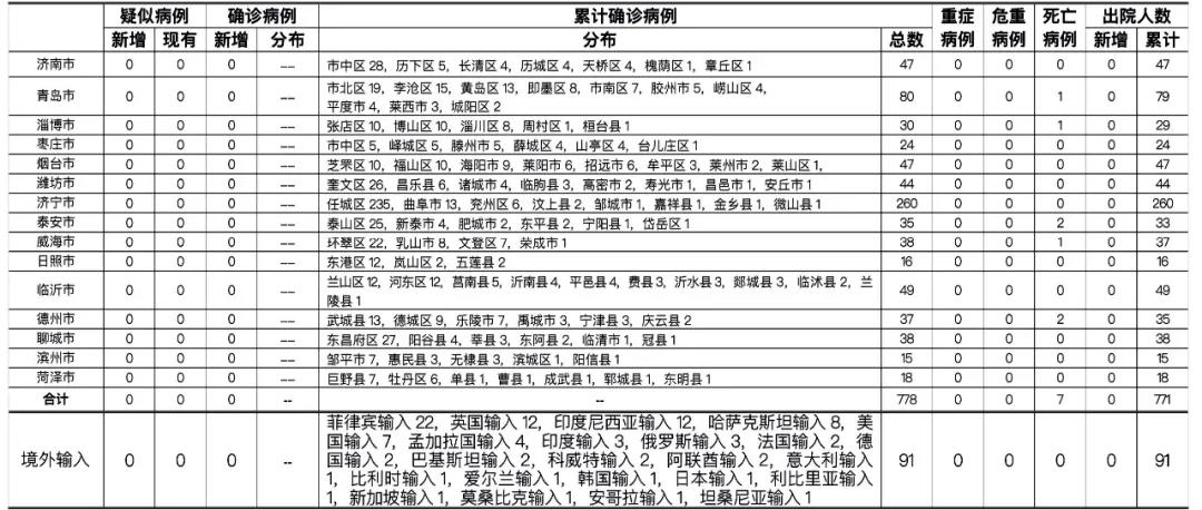 备注:1.山东省本地病例按确诊时医院所在县区统计,境外输入病例单独统计。