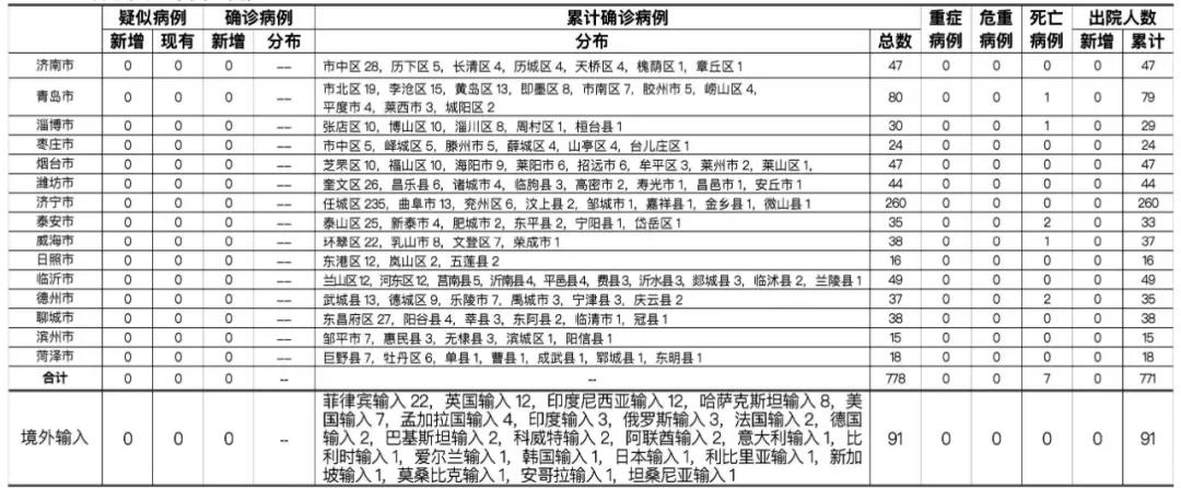 备注:1.山东省本地病例按确诊时医院所在县区统计,境外输入病例单独统计。