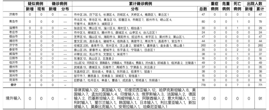 备注:1.山东省本地病例按确诊时医院所在县区统计,境外输入病例单独统计。