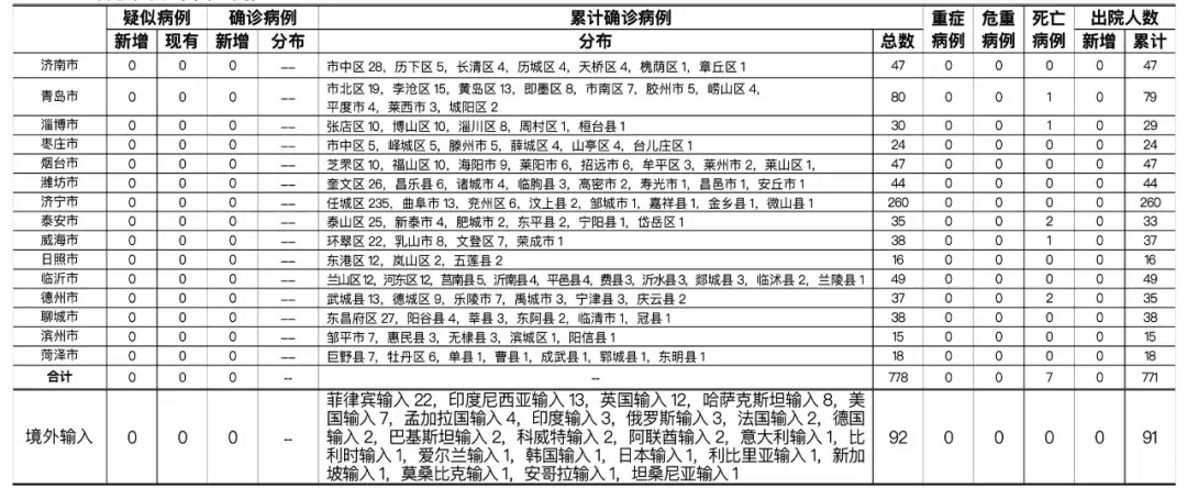 山东无新增本地疑似病例、确诊病例。累计报告确诊病例778例,死亡7例,治愈出院771例。