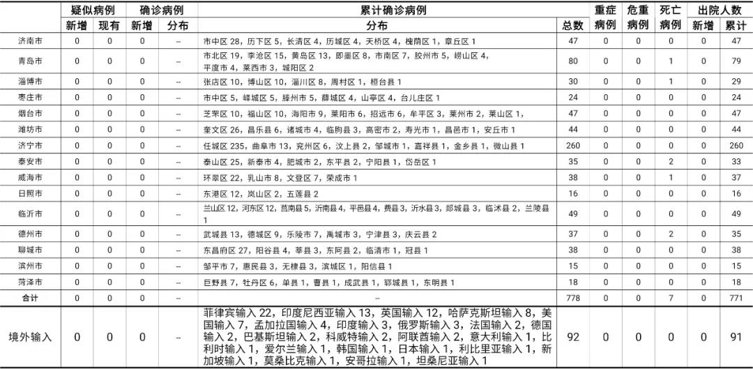 备注:1.山东省本地病例按确诊时医院所在县区统计,境外输入病例单独统计。