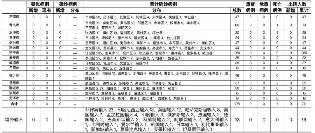 山东无新增本地疑似病例、确诊病例。累计报告确诊病例778例,死亡7例,治愈出院771例。