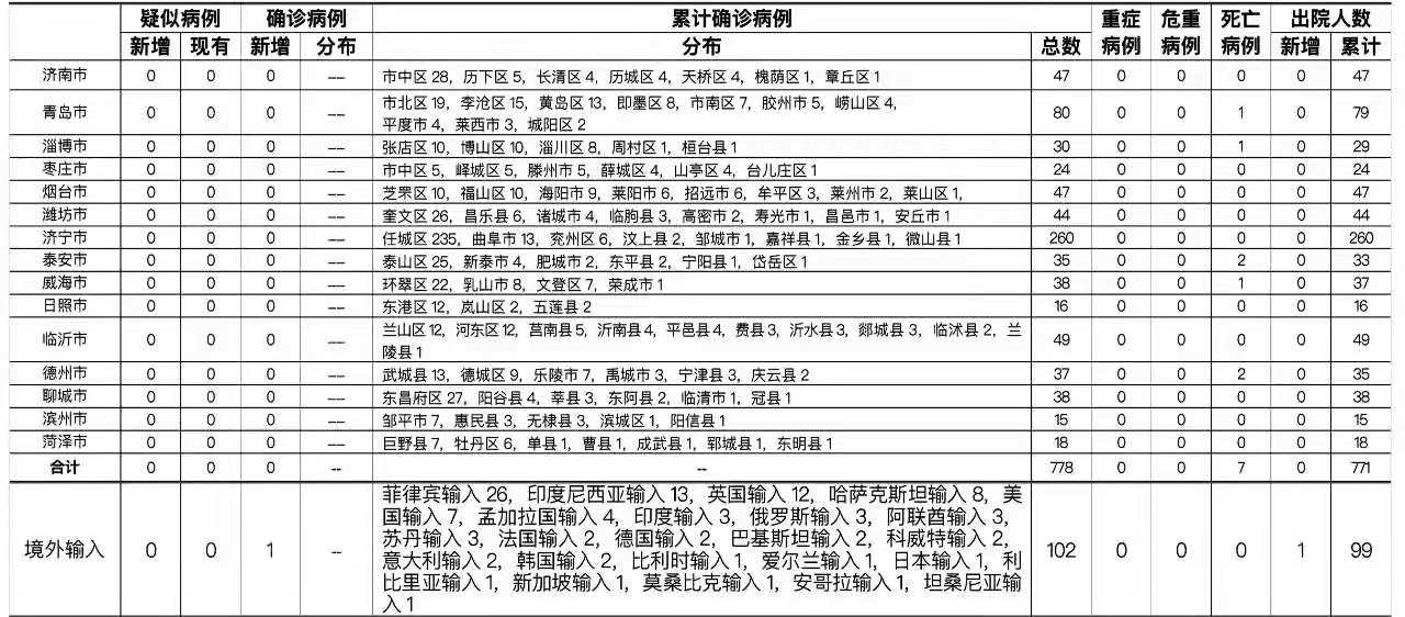 备注:1.山东省本地病例按确诊时医院所在县区统计,境外输入病例单独统计。