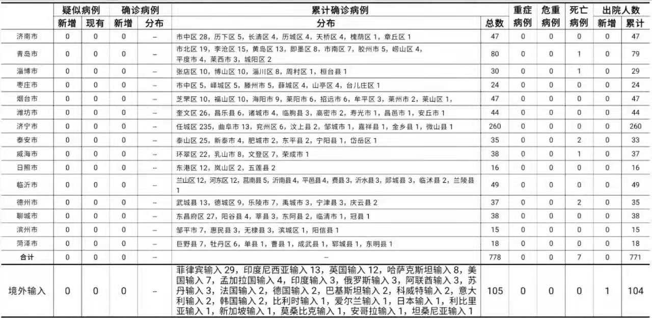 备注:1.山东省本地病例按确诊时医院所在县区统计,境外输入病例单独统计。