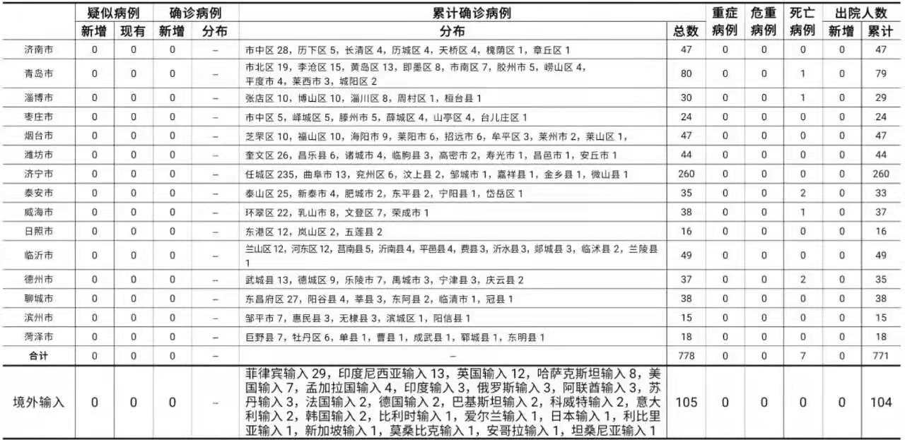 山东无新增本地疑似病例、确诊病例。累计报告确诊病例778例,死亡7例,治愈出院771例。山东无新增境外输入疑似病例、确诊病例。累计报告境外输入确诊病例105例,累计治愈出院104例。正在住院治疗的确诊病例1例。山东无新增无症状感染者。正在隔离观察治疗的无症状感染者6例(境外输入6例)。2020年以来全省共追踪到密切接触者30187人,目前尚有32人正在接受医学隔离观察。详见下表(单位:例):