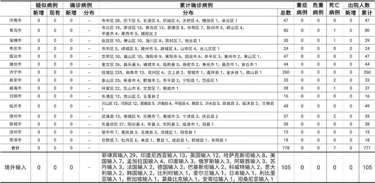 备注:1.山东省本地病例按确诊时医院所在县区统计,境外输入病例单独统计。