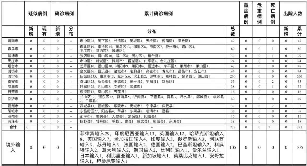 山东无新增本地疑似病例、确诊病例。累计报告确诊病例778例,死亡7例,治愈出院771例。
