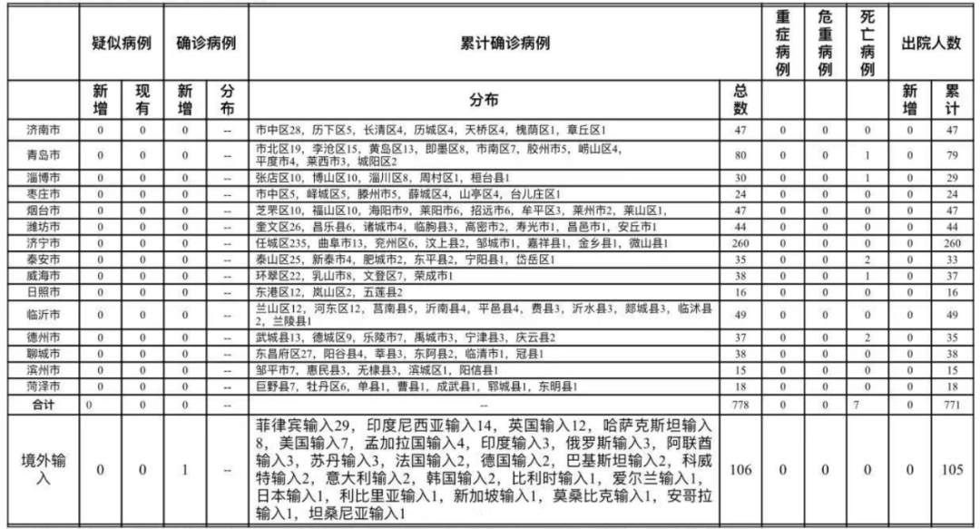 备注:1.山东省本地病例按确诊时医院所在县区统计,境外输入病例单独统计。